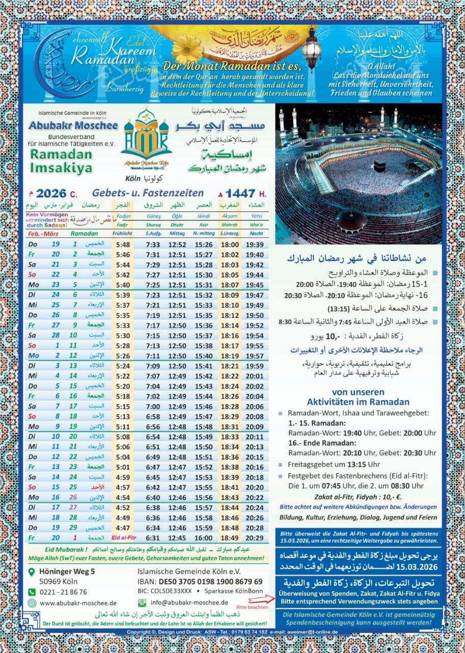 Unser islamischer Verein hat eine Jahrzehnte lange Geschichte in Köln. Neben einem Begegnungsort für Gebete und Feste ist die Abu Bakr Moschee ein Ort, um umfangreiches religiöses und kulturelles Wissen zu erlangen.
